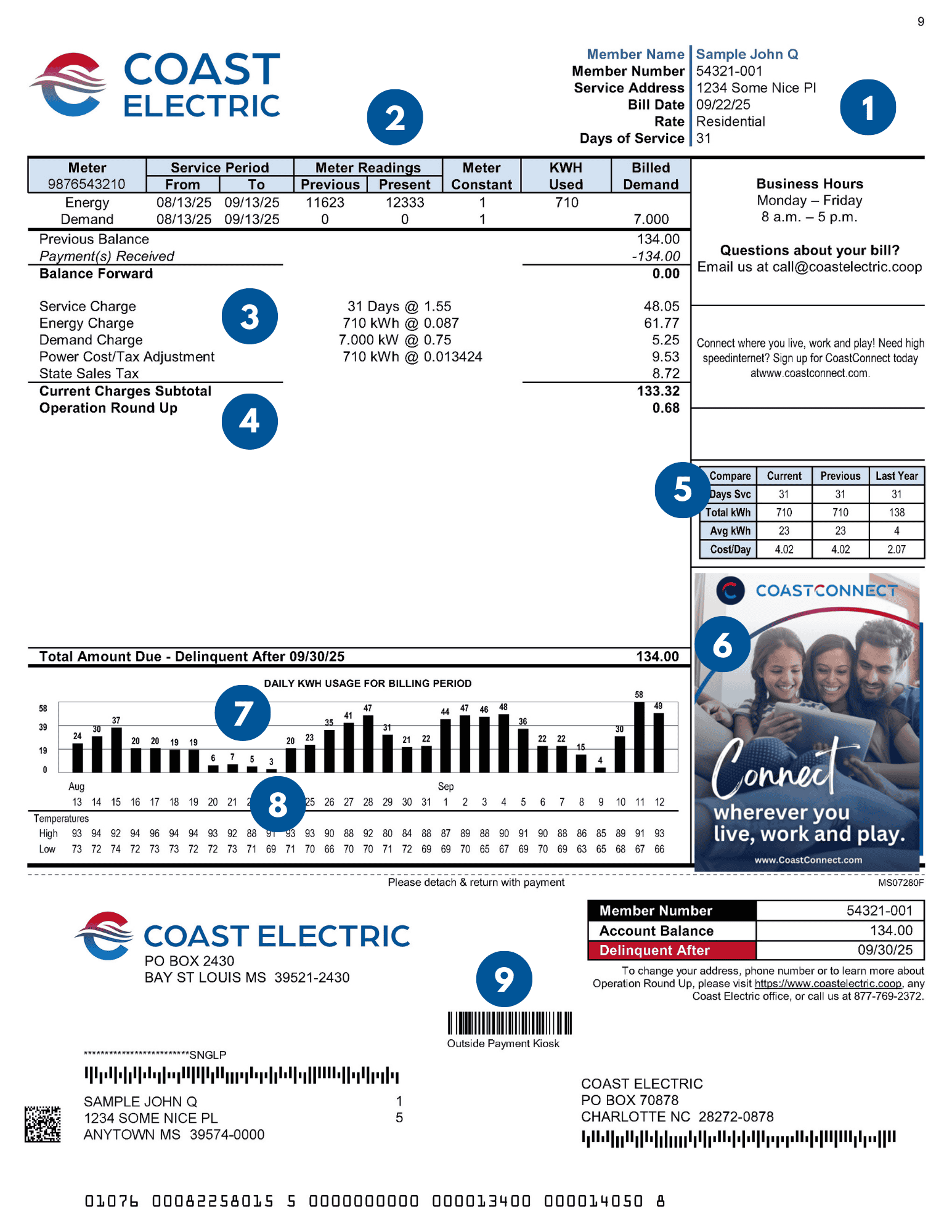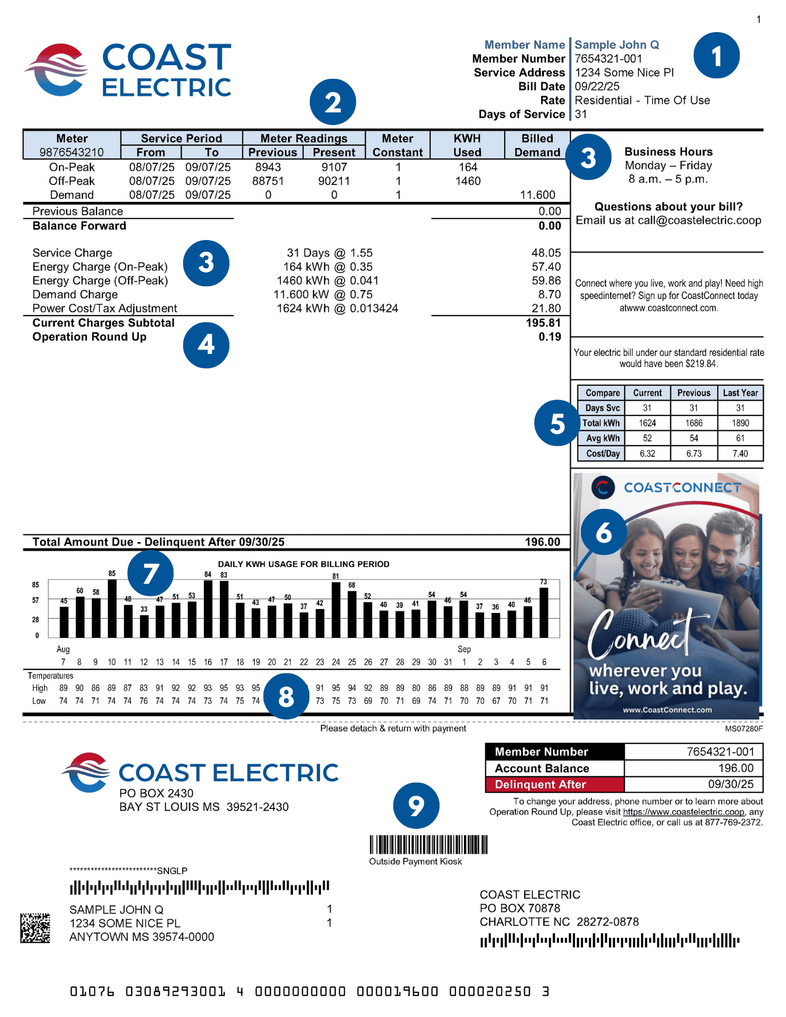 Your electric bill is made up of various charges that include items like the cost of power generation, infrastructure, the amount of energy you use and more. We want to give you the tools you need to understand the charges that make up your Coast Electric bill. Besides using the tools on this page, we encourage you to log on to your account here to get details about your electric use. If you need more information, we are always here for you. Our team of member service representatives and our energy experts can help you understand your bill, your energy use patterns and can tell you about ways you can reduce your use and save!
